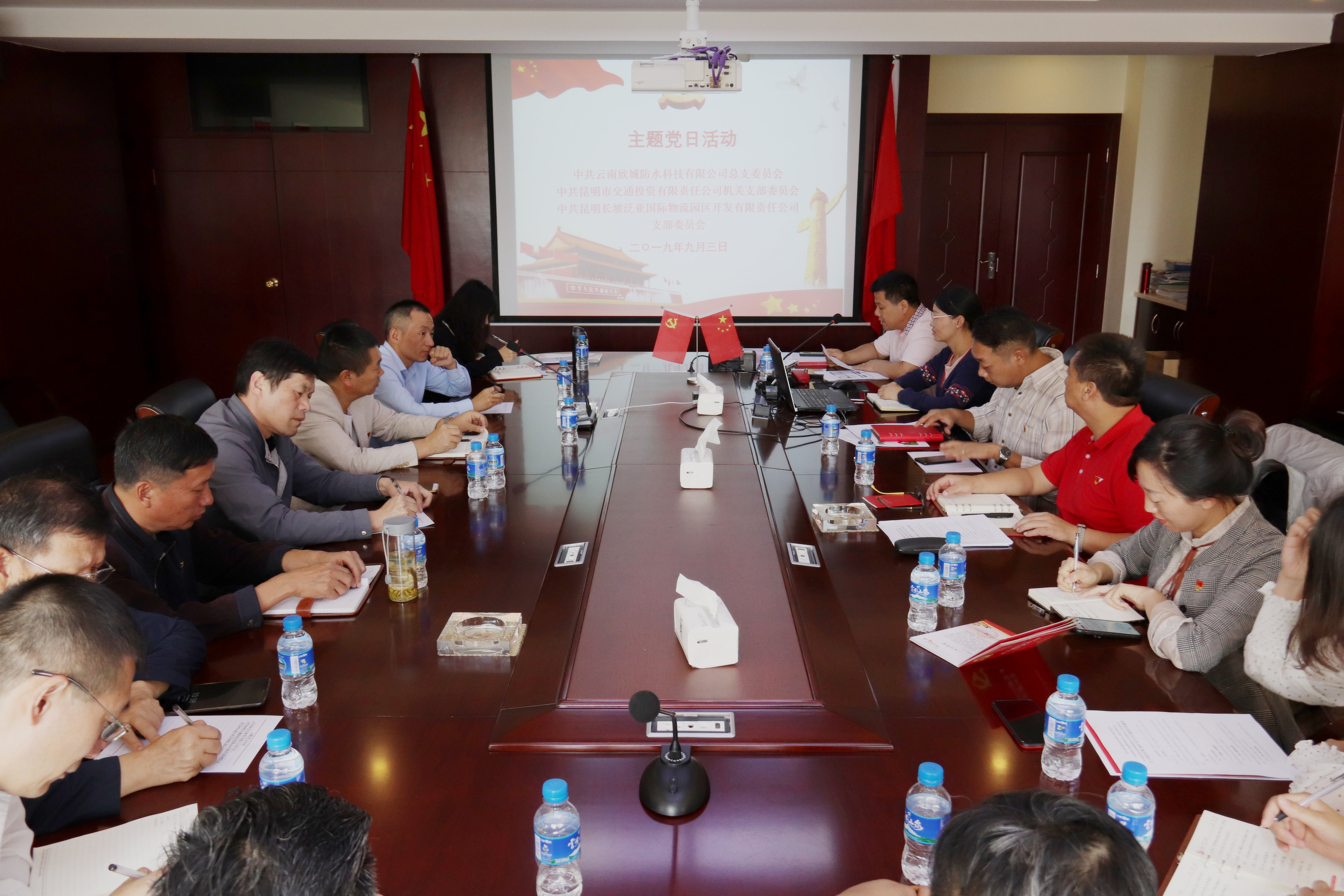 2019年9月3日,昆明交投机关党支部、昆明长坡泛亚国际物流园区开发有限公司党支部联合民营企业云南欣城防水科技有限公司党总支共同开展主题党日活动。本次活动是昆明交投党委落实昆明市国企工委关于国有企业党组织帮带民营企业党建工作方案的一次体现,也是昆明交投与民营企业党组织进一步开展帮带、互带互动、双向促进的帮带工作的开端。