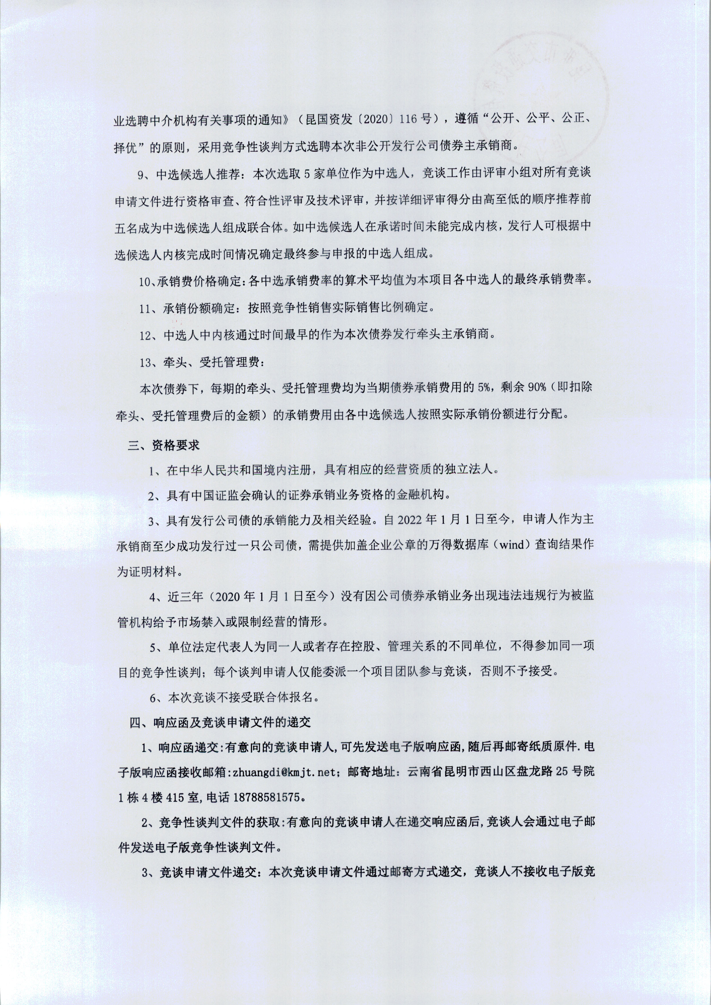 关于选聘非公开发行公司债券主承销商竞争性谈判公告