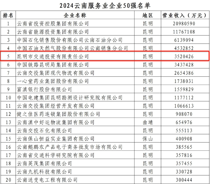 11月22日,云南省企业联合会、云南省企业家协会正式揭晓2024年“云南企业100强”及 “云南服务业企业50强” 榜单。昆明交投公司在“云南企业100强”中荣列第12位,在“云南服务业企业50强”中,也取得第5名的优异成绩。