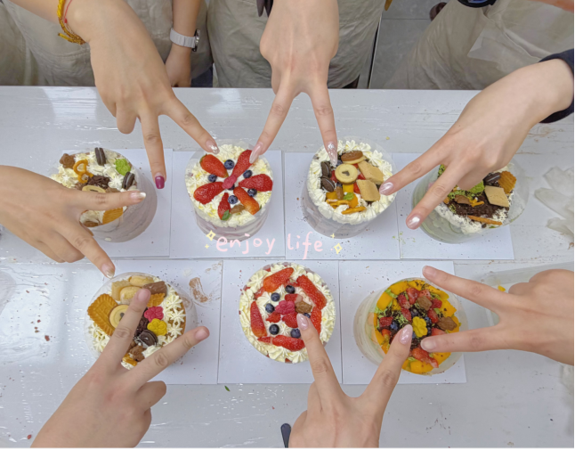 活动现场,专业烘焙老师讲解了蛋糕裱花与水果搭配的制作技巧。大家纷纷动手实操,从涂抹奶油到摆放水果,从勾勒花纹到创意点缀,每一个环节都融入了专注与巧思。在轻松愉悦的氛围中,大家相互交流心得、分享创意灵感,不仅收获了亲手制作的甜品,更在协作中增进了情谊,在创造中收获了快乐。